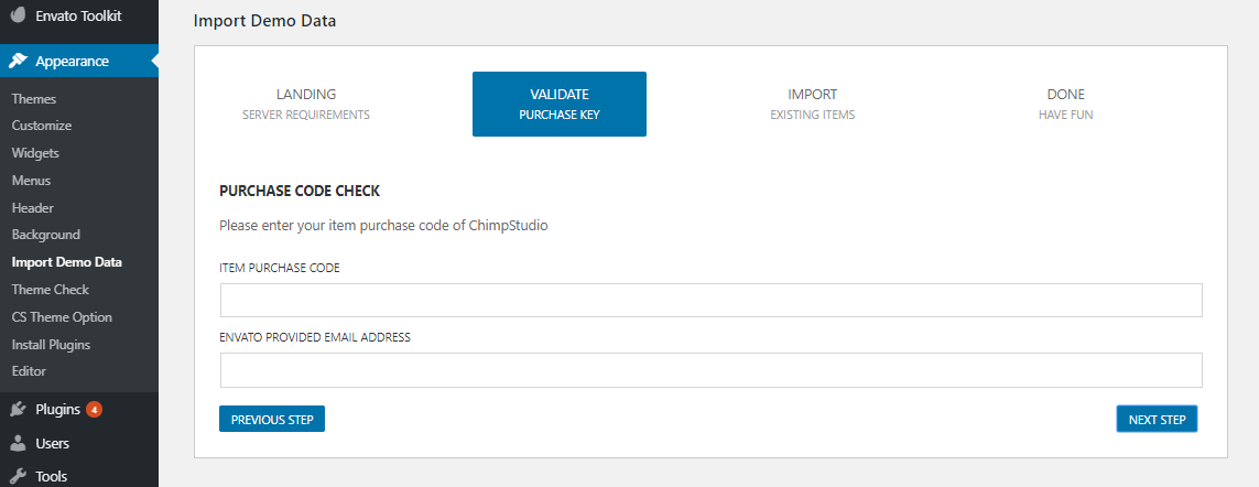 Note: Required plugins must be activated, otherwise theme will not function properly. However, optional plugins are your choice. Activate them only if they are required.