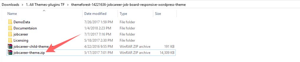 Please unpack (unzip) the whole package after downloading it from ThemeForest. In the package, You will find Documentation, license, zipped file with theme files and folder called JobCareer Theme.